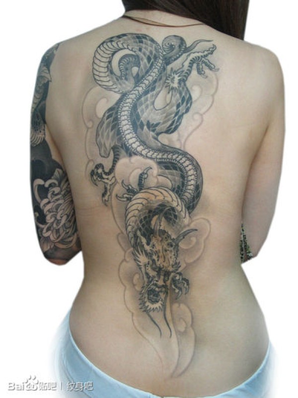 女生后背经典潮流的传统黑灰龙纹身图案_女生纹身图案大全_纹身图吧