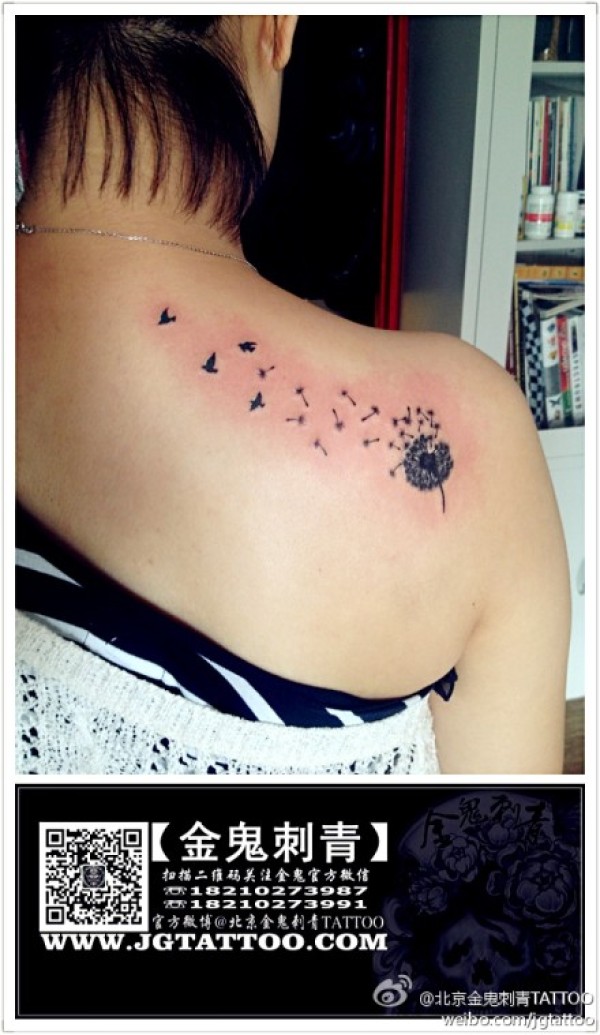女生肩背时尚潮流的蒲公英与小鸟纹身图案_女生纹身图案大全_纹身图吧