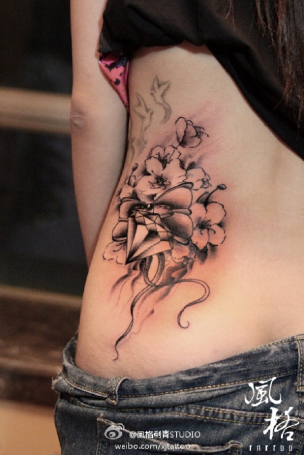 女生腰部唯美潮流的黑灰钻石花卉纹身图案_女生纹身图案大全_纹身图吧