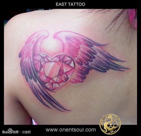 女生肩背潮流经典的爱心钻石翅膀纹身图案_女生纹身图案大全_纹身图吧