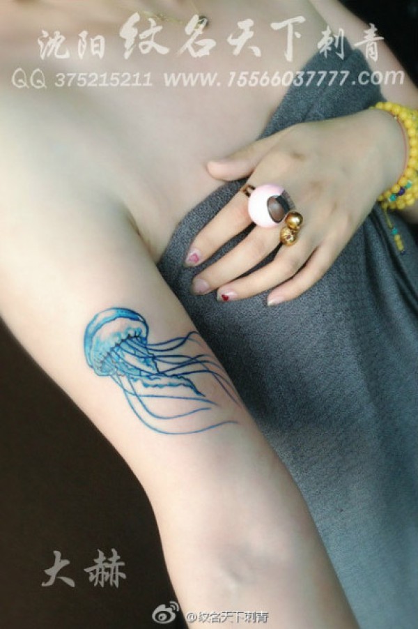 女生手臂唯美潮流的彩色水母纹身图案_女生纹身图案大全_纹身图吧