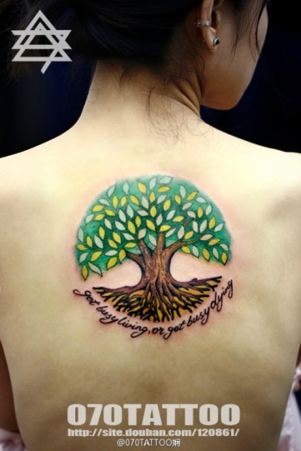 女生后背唯美潮流的彩色小树纹身图案_女生纹身图案大全_纹身图吧