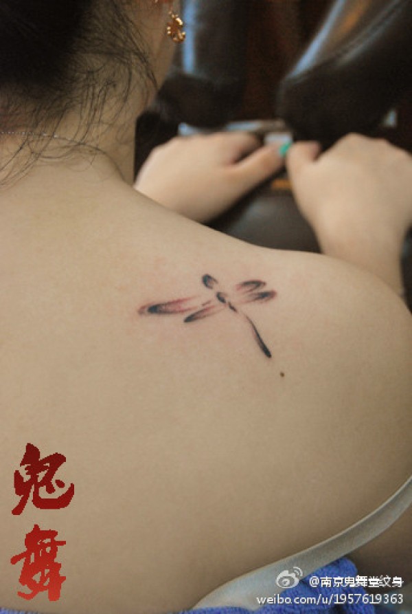 女生肩膀处小巧潮流的蜻蜓纹身图案_女生纹身图案大全_纹身图吧