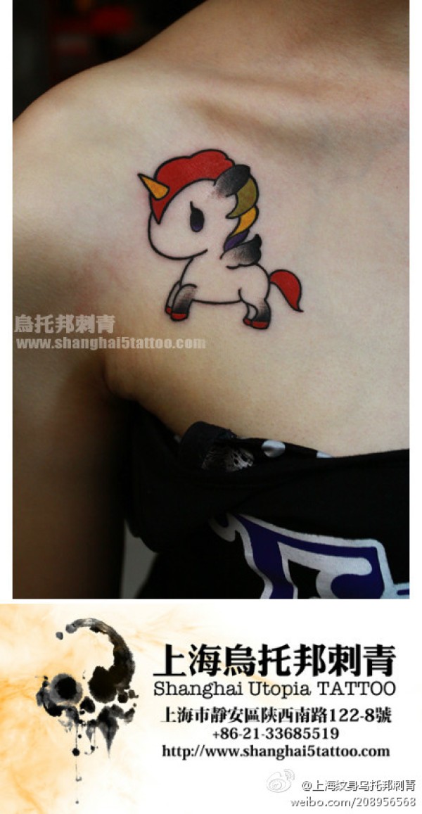 女生肩膀处小巧可爱的独角兽纹身图案_女生纹身图案大全_纹身图吧