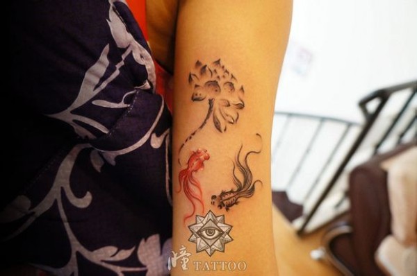 女生手臂唯美潮流的水墨写意莲花与金鱼纹身图_女生纹身图案大全_纹身图吧