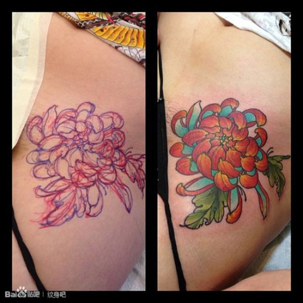 女生腹部时尚好看的彩色菊花纹身图案_女生纹身图案大全_纹身图吧