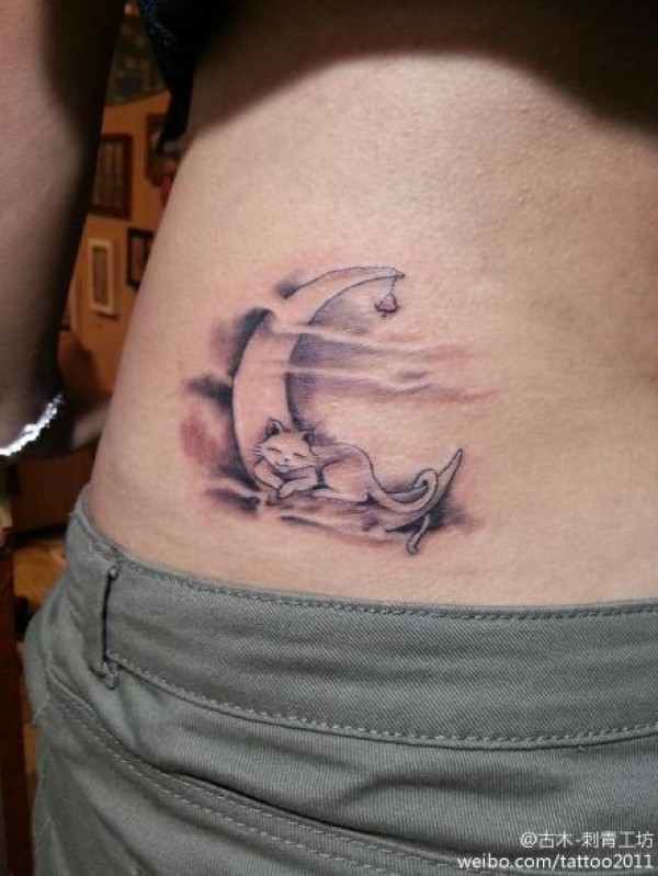 女生腰部可爱的月亮与猫咪纹身图案_女生纹身图案大全_纹身图吧