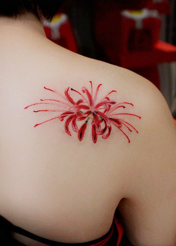 女生肩背潮流好看的彩色彼岸花纹身图案_女生纹身图案大全_纹身图吧