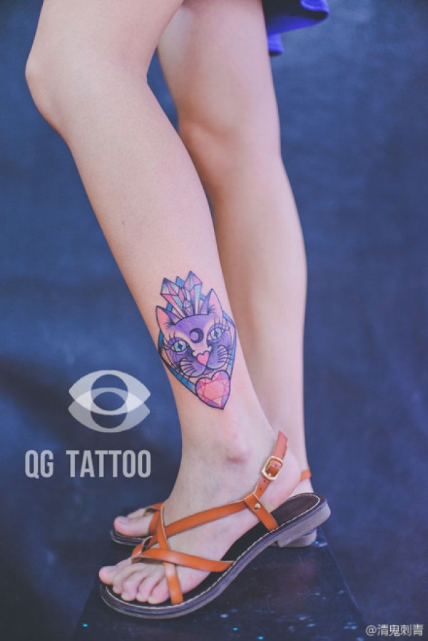 女生腿部时尚潮流的猫咪与钻石纹身图案_女生纹身图案大全_纹身图吧