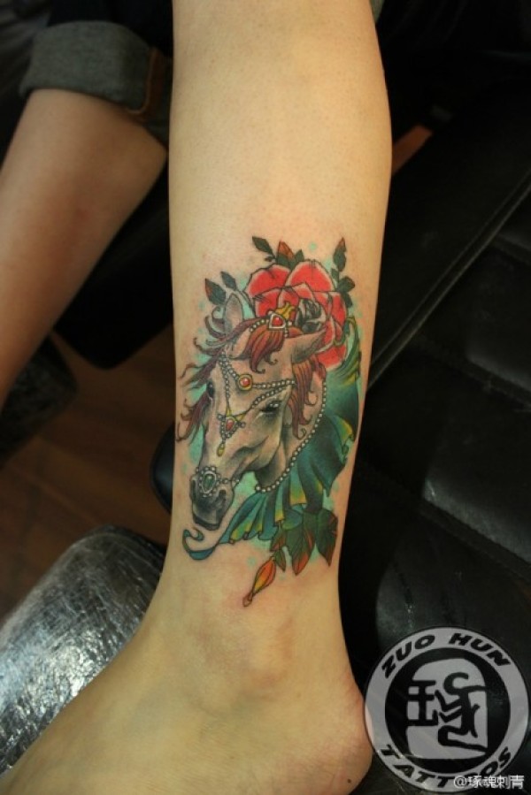 女生腿部精美很酷的一款马纹身图案_女生纹身图案大全_纹身图吧