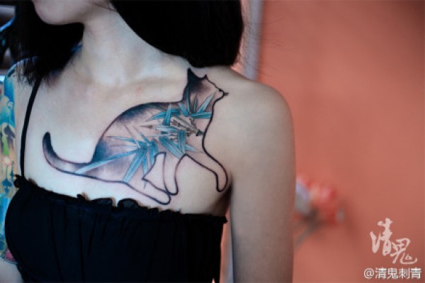 女生胸前唯美时尚的猫咪纹身图案_女生纹身图案大全_纹身图吧