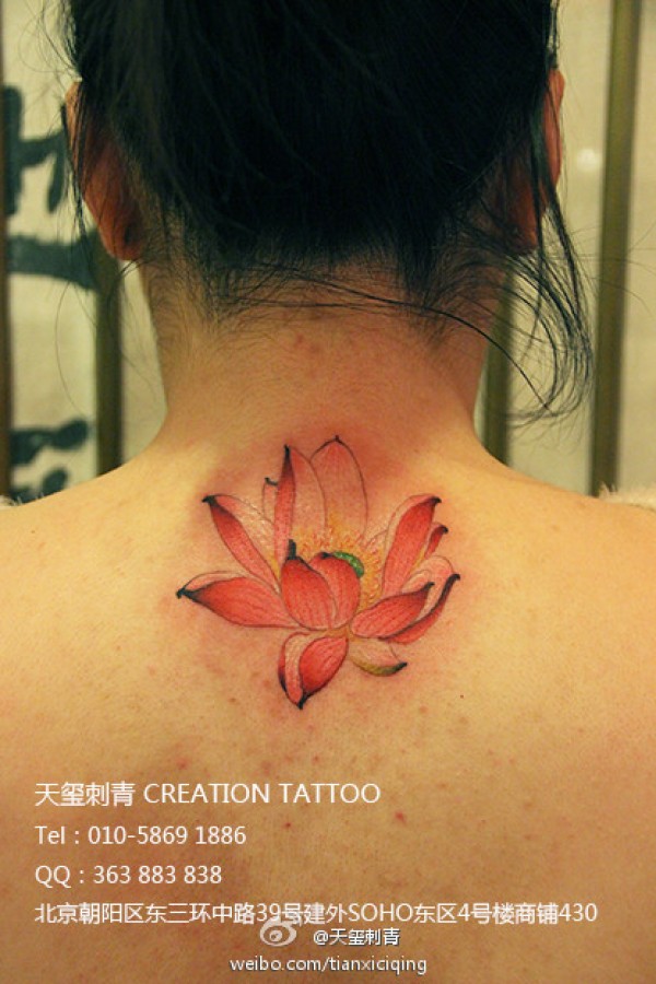 女生后颈部唯美潮流的粉色莲花纹身图案_女生纹身图案大全_纹身图吧
