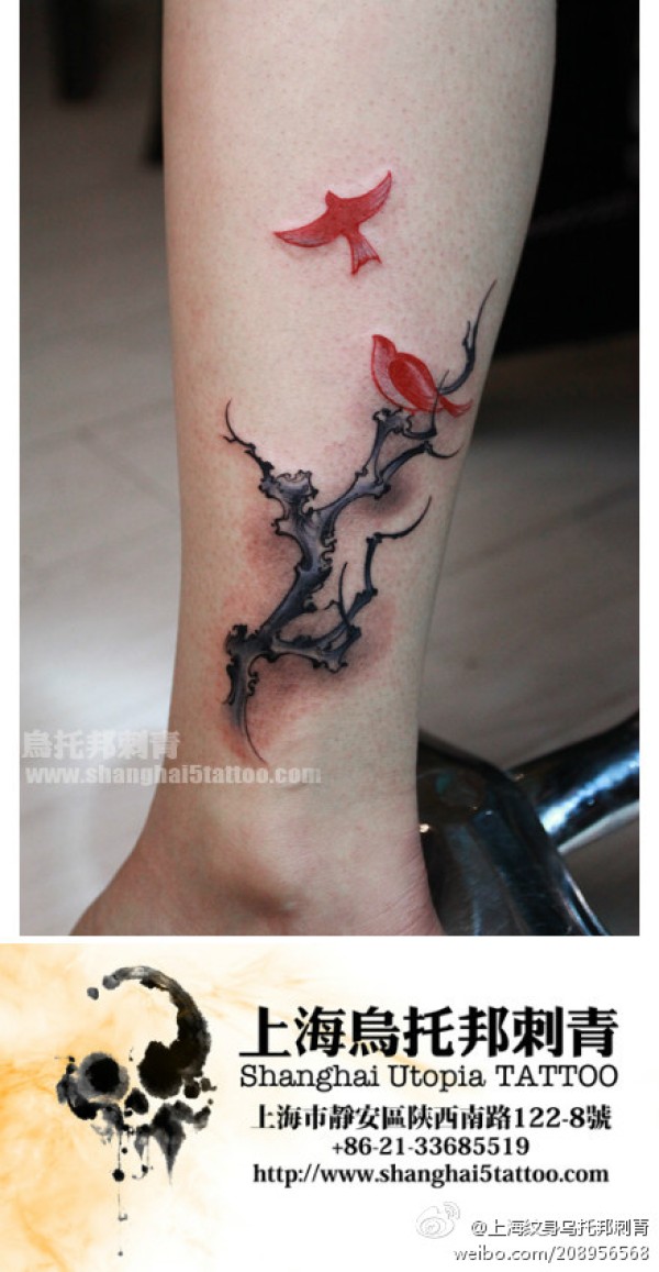 女生腿部唯美时尚的小树与小鸟纹身图案_女生纹身图案大全_纹身图吧