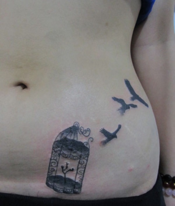 美女腹部时尚潮流的鸟笼与小鸟纹身图案_女生纹身图案大全_纹身图吧