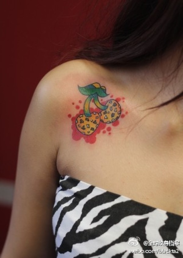 女生肩膀处潮流小巧的豹纹樱桃纹身图案_女生纹身图案大全_纹身图吧