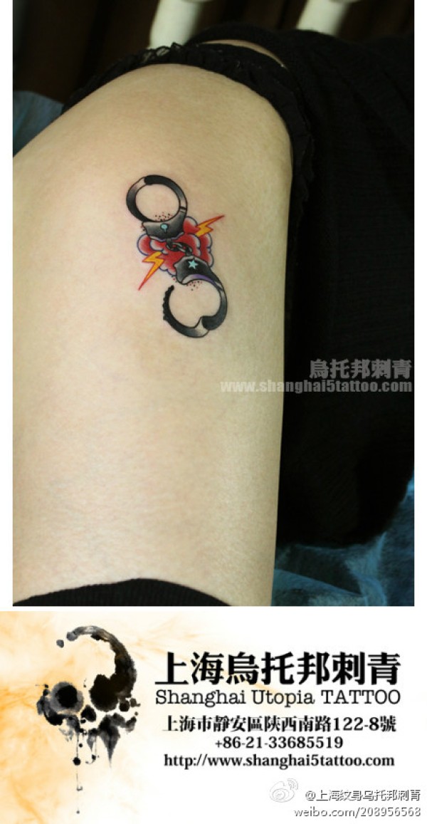 女生腿部小巧潮流的一款手铐纹身图案_女生纹身图案大全_纹身图吧