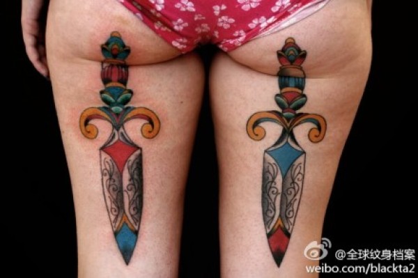 女生腿部经典潮流的匕首纹身图案_女生纹身图案大全_纹身图吧