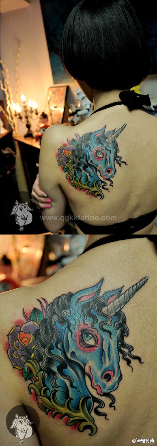 女生肩背经典很酷的独角兽纹身图案_女生纹身图案大全_纹身图吧