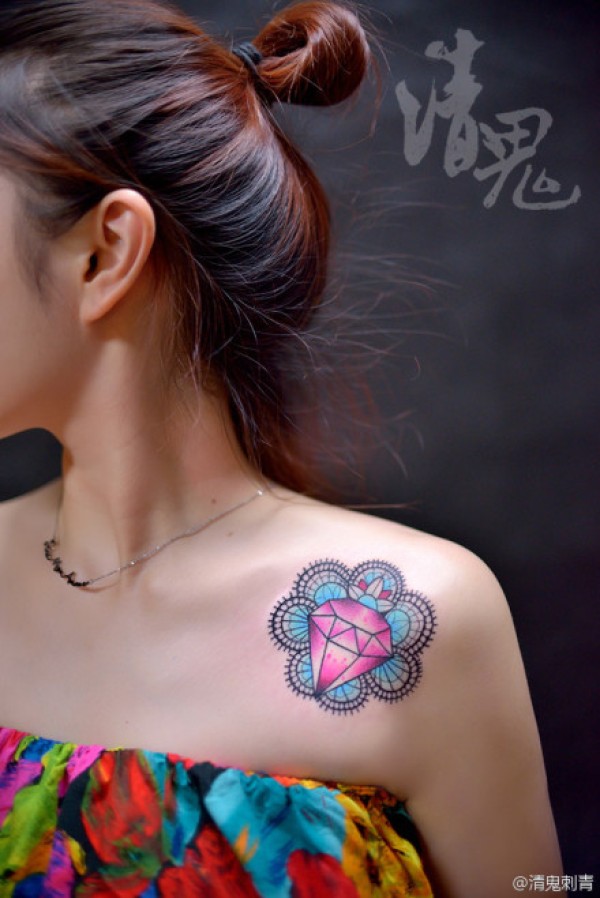 女生肩膀处小巧艳丽的彩色钻石纹身图案_女生纹身图案大全_纹身图吧