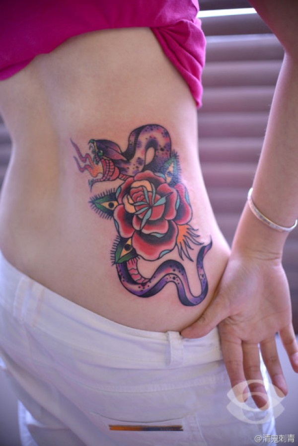 女生腰部唯美漂亮的彩色蛇纹身图案_女生纹身图案大全_纹身图吧
