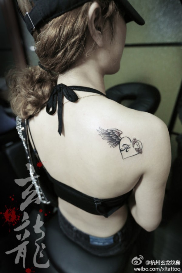 女生肩背小巧唯美的翅膀爱心纹身图案_女生纹身图案大全_纹身图吧