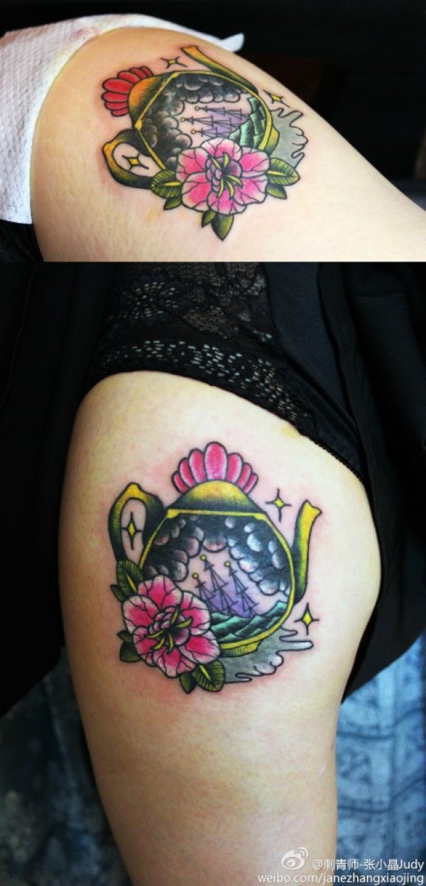 女生腿部潮流经典的茶壶纹身图案_女生纹身图案大全_纹身图吧