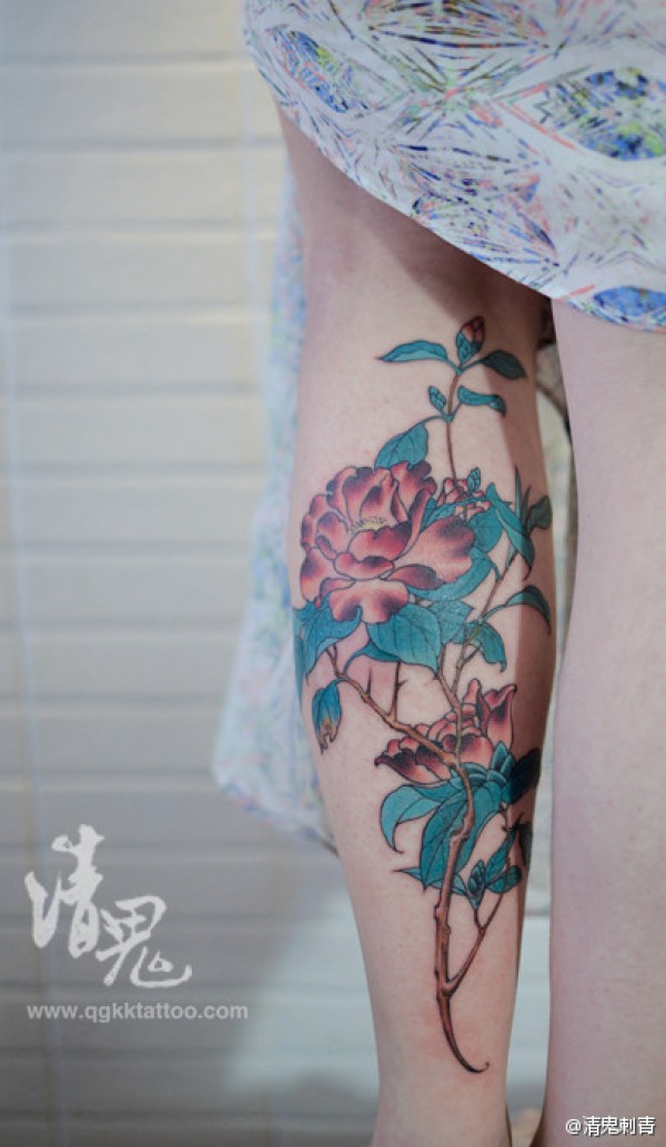 女生腿部潮流精美的彩色牡丹纹身图案_女生纹身图案大全_纹身图吧