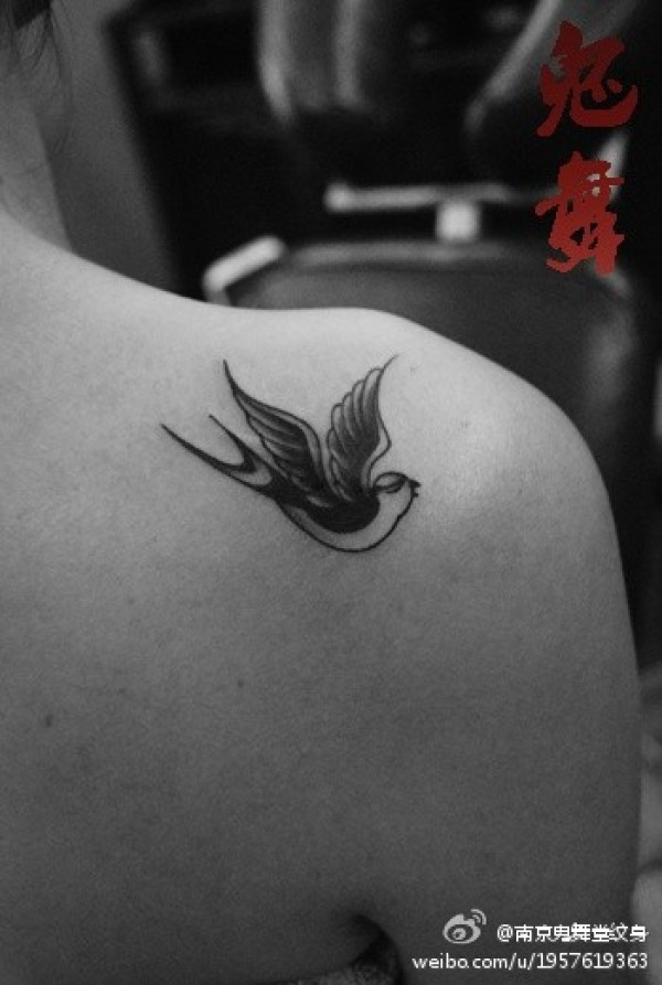 女生肩膀处小巧时尚的黑灰燕子纹身图案_女生纹身图案大全_纹身图吧
