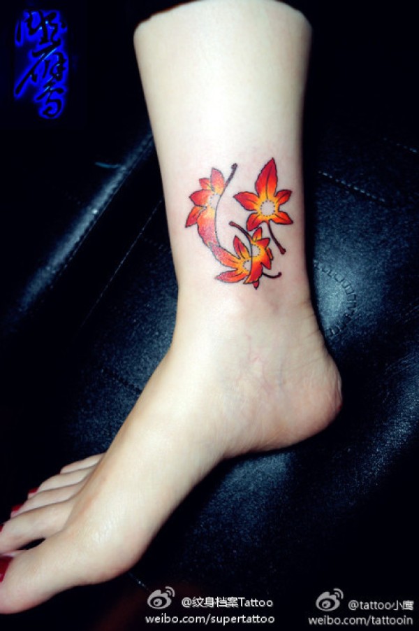 女生小腿脚踝处小巧潮流的枫叶纹身图案_女生纹身图案大全_纹身图吧
