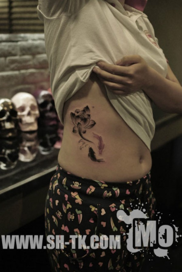 女生腰部唯美时尚的莲花与小鱼纹身图案_女生纹身图案大全_纹身图吧