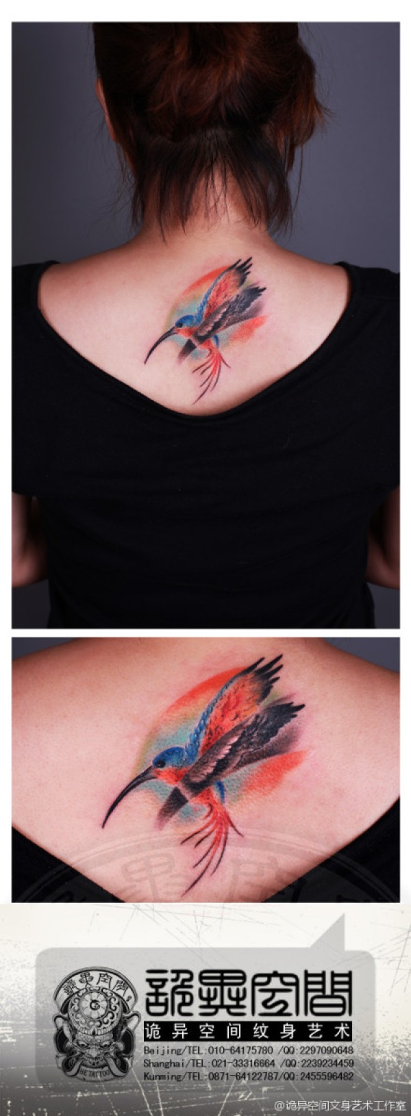 女生后背漂亮时尚的彩色蜂鸟纹身图案_女生纹身图案大全_纹身图吧
