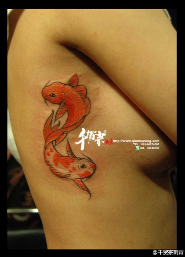 女生胸部漂亮时尚的彩色小金鱼纹身图案_女生纹身图案大全_纹身图吧
