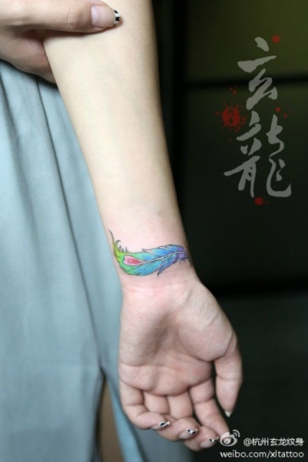 女生手腕小巧的彩色羽毛纹身图案_女生纹身图案大全_纹身图吧