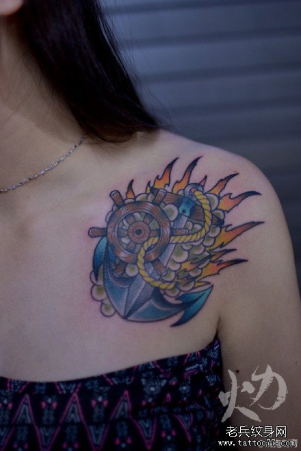 女生肩膀处时尚潮流的船锚船舵纹身图案_女生纹身图案大全_纹身图吧