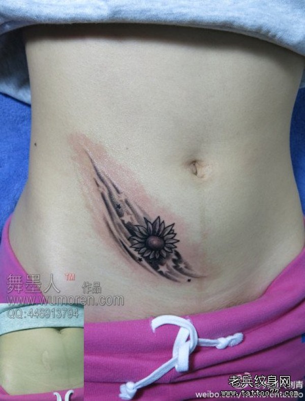 女生腹部唯美的黑灰向日葵花纹身图案_女生纹身图案大全_纹身图吧