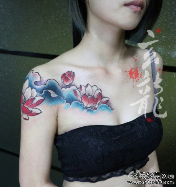 女生肩膀处漂亮时尚的彩色莲花纹身图案_女生纹身图案大全_纹身图吧