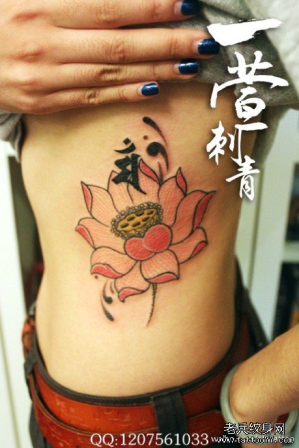 女生侧腰漂亮的传统彩色莲花纹身图案_女生纹身图案大全_纹身图吧