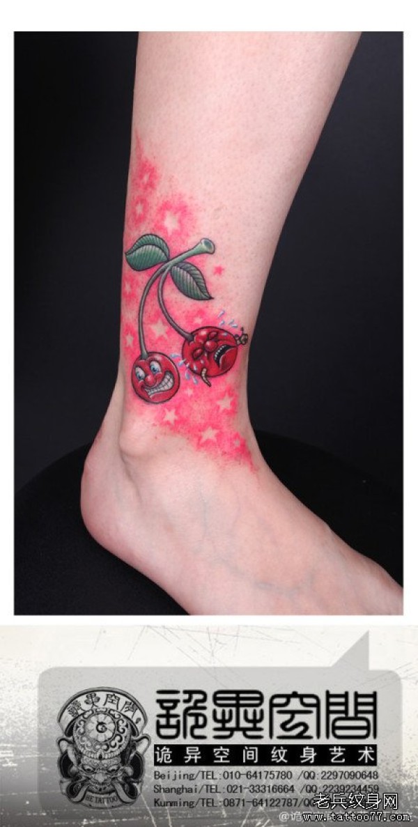 女生腿部一款哭笑的樱桃纹身图案_女生纹身图案大全_纹身图吧