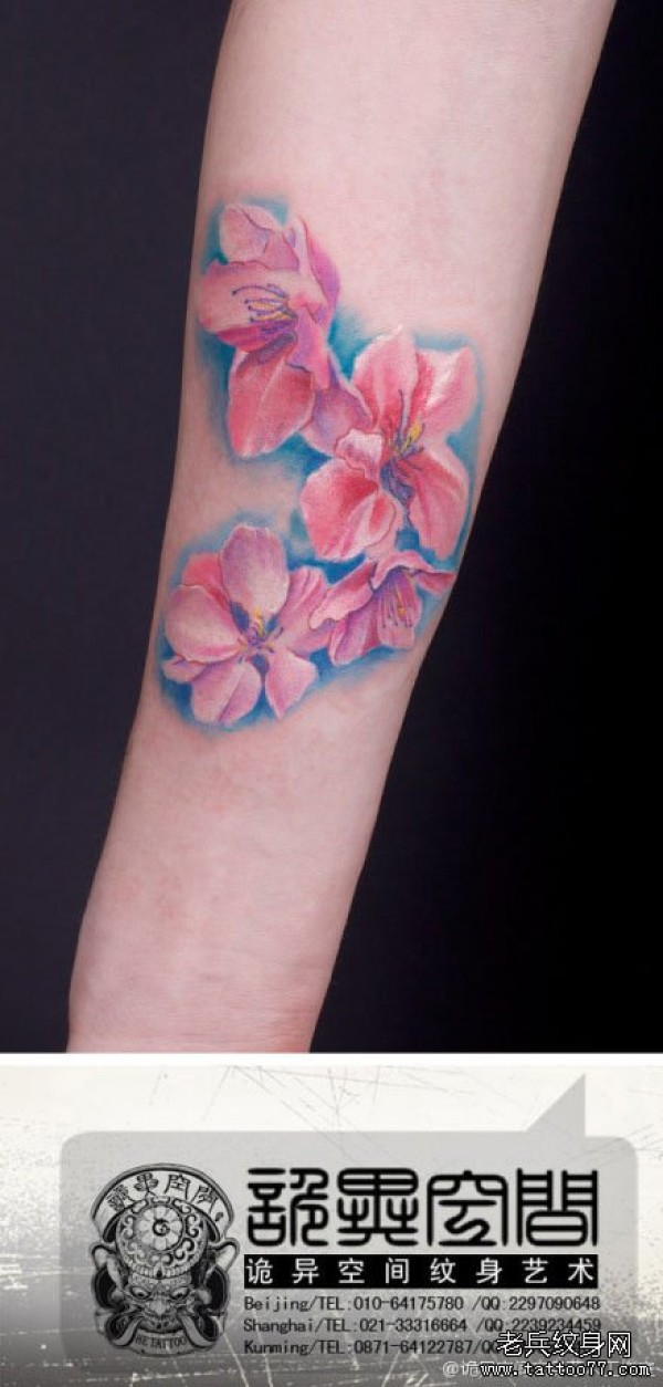 女生手臂漂亮好看的彩色桃花纹身图案_女生纹身图案大全_纹身图吧
