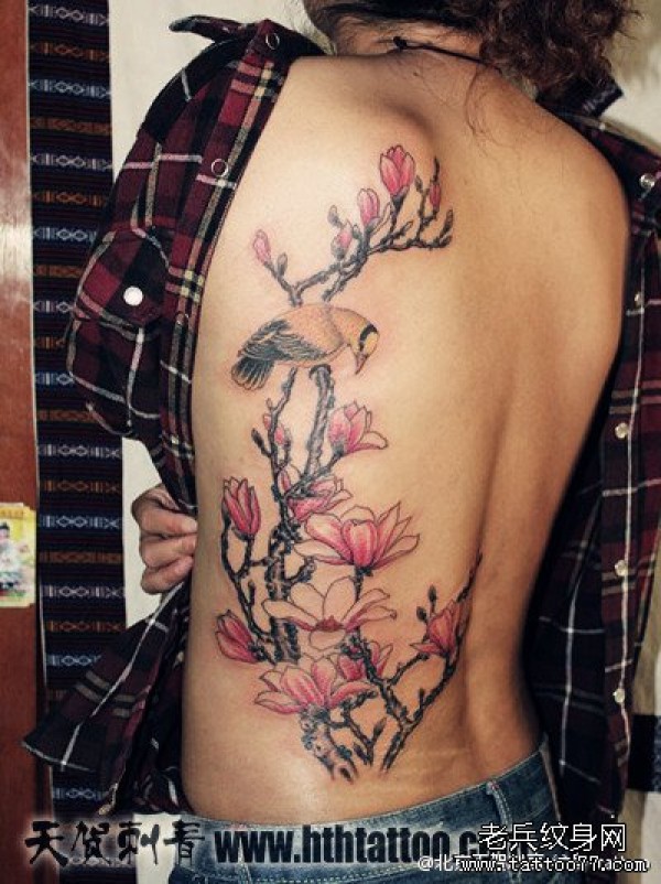 女生后背唯美好看的小鸟与花卉纹身图案_女生纹身图案大全_纹身图吧