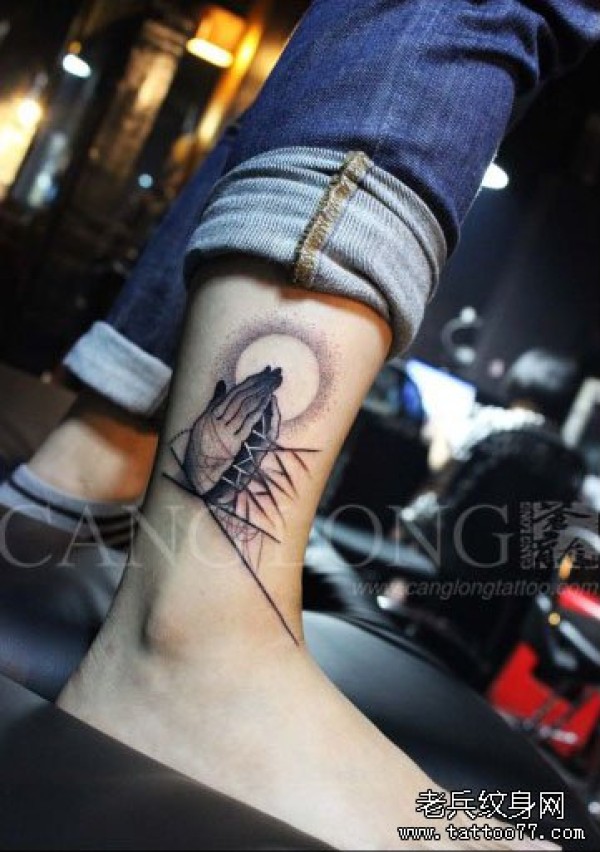 女生腿部流行经典的祈祷之手纹身图案_女生纹身图案大全_纹身图吧