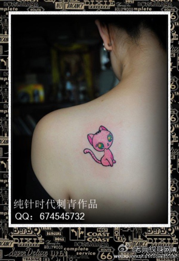 女生后肩背可爱的粉色小猫咪纹身图案_女生纹身图案大全_纹身图吧