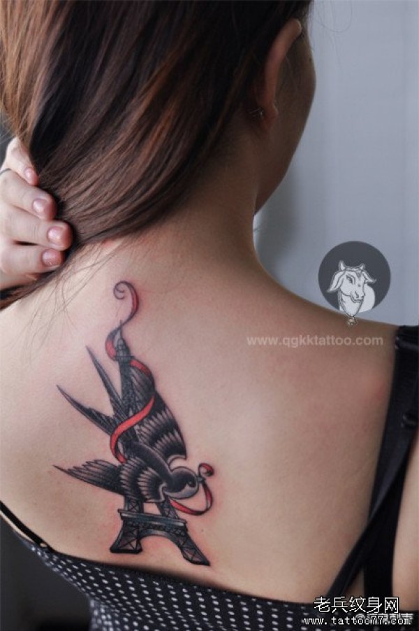 女生后背潮流的小燕子与埃菲尔铁塔纹身图案_女生纹身图案大全_纹身图吧