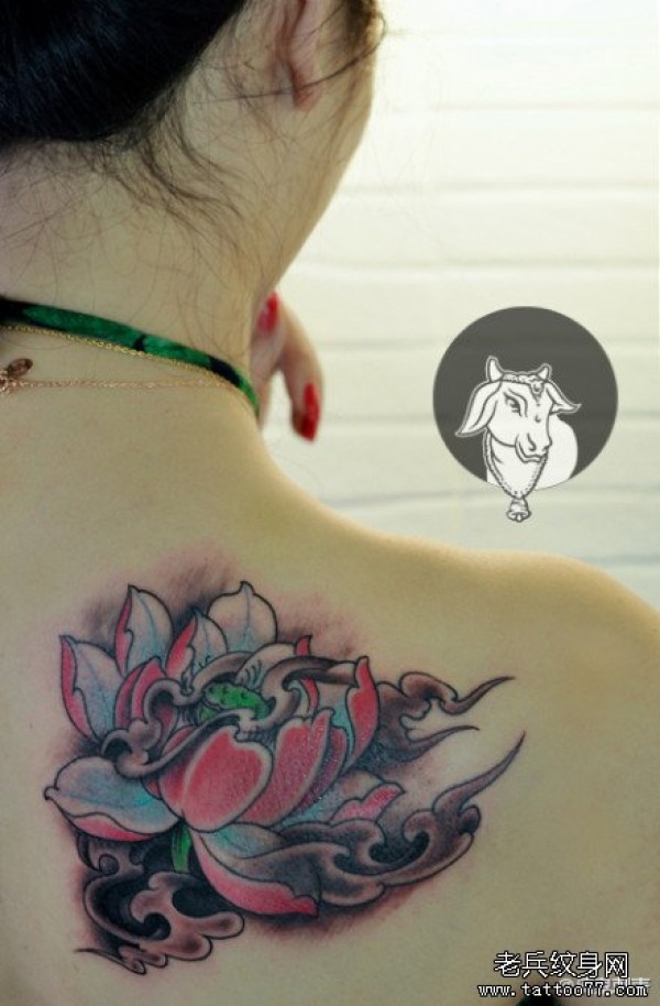 女生后肩背唯美漂亮的彩色莲花纹身图案_女生纹身图案大全_纹身图吧