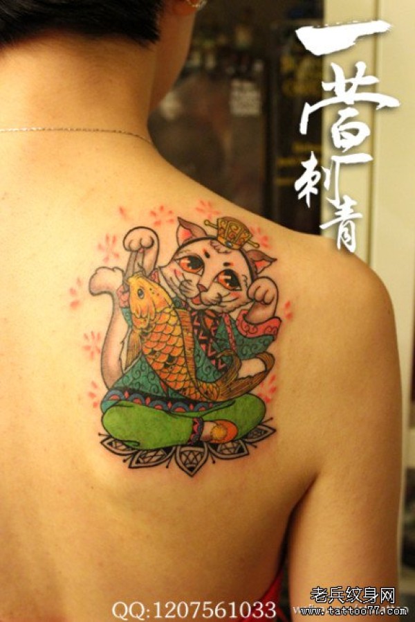 女生后肩背可爱潮流的猫咪纹身图案_女生纹身图案大全_纹身图吧