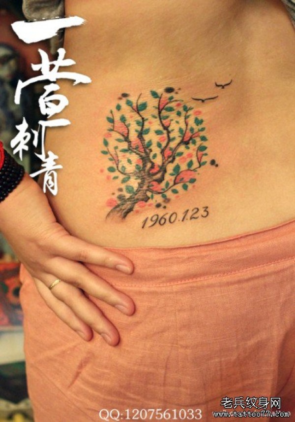 女生腰部潮流时尚的彩色小树纹身图案_女生纹身图案大全_纹身图吧