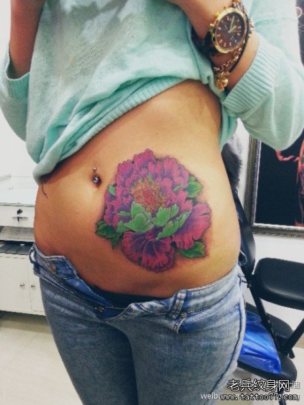 女生腹部唯美潮流的传统彩色牡丹纹身图案_女生纹身图案大全_纹身图吧