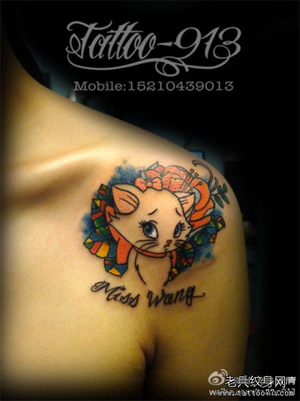 女生肩膀处一款受委屈的猫咪纹身图案_女生纹身图案大全_纹身图吧