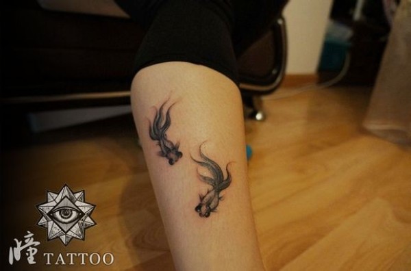 女生腿部一款小巧流行的黑灰小金鱼纹身图案_女生纹身图案大全_纹身图吧