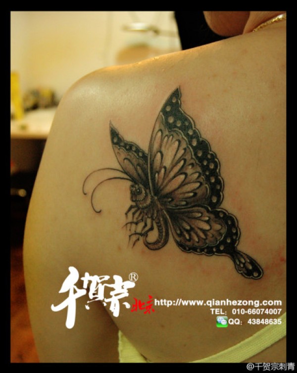 女生后肩背潮流时尚的黑灰翅膀纹身图案_女生纹身图案大全_纹身图吧